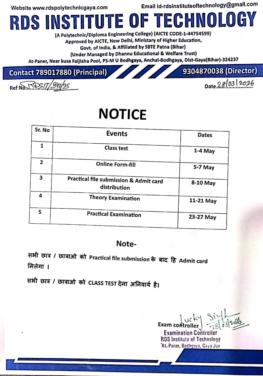 RDS Institute of Technology has been established in the year 2017. (Approved by AICTE NEW DELHI AND Affiliated by SBTE BIHAR PATNA)